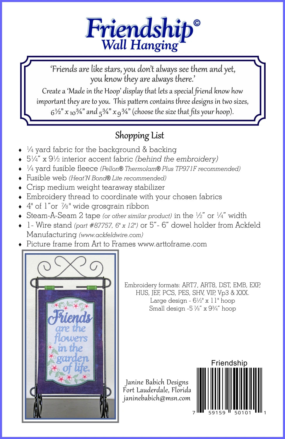 Friends are like stars, you don't always see them and yet you know they are always there.' Create a 'Made in the Hoop' display/wall hanging that lets a special friend know how important they are to you. This pattern contains three (3) designs in two sizes, 6.5in x 10.75in and 5.75in x 9.75in. Includes embroidery formats: ART7, ART8, DST, EMB, EXP, HUS, JEF, PCS, PES, VP3 & XXX. Minimum hoop requirement- 5-7/8in x 9.75in hoop.