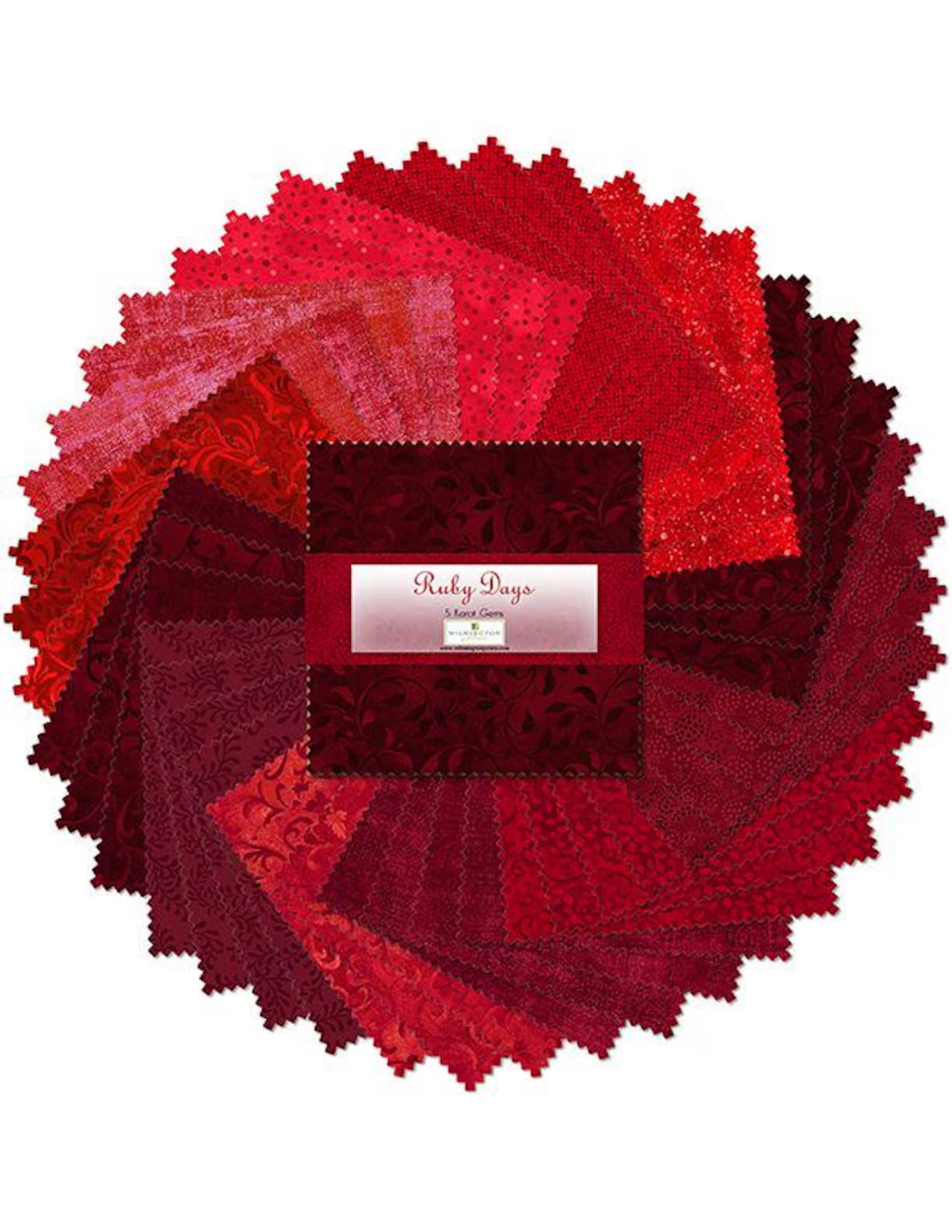 The finished tree skirt measures approximately 57½" x 57½", featuring a modern octagonal shape and classic pieced layout. The kit includes Wilmington’s 5 Karat Gems (5" fabric squares) from the Ruby Days, Dry Brush White, and Dry Brush Silver collections, plus coordinating border, binding, and tie fabrics — all 100% premium quilting cotton.